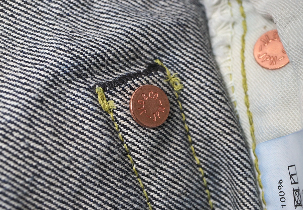 片面レーヨンタブ、銅ずくのオリジナルリベット、革パッチはホースレザーを使っており表面が粗いのでプリントがのりにくく個体差の出るパッチにしております。