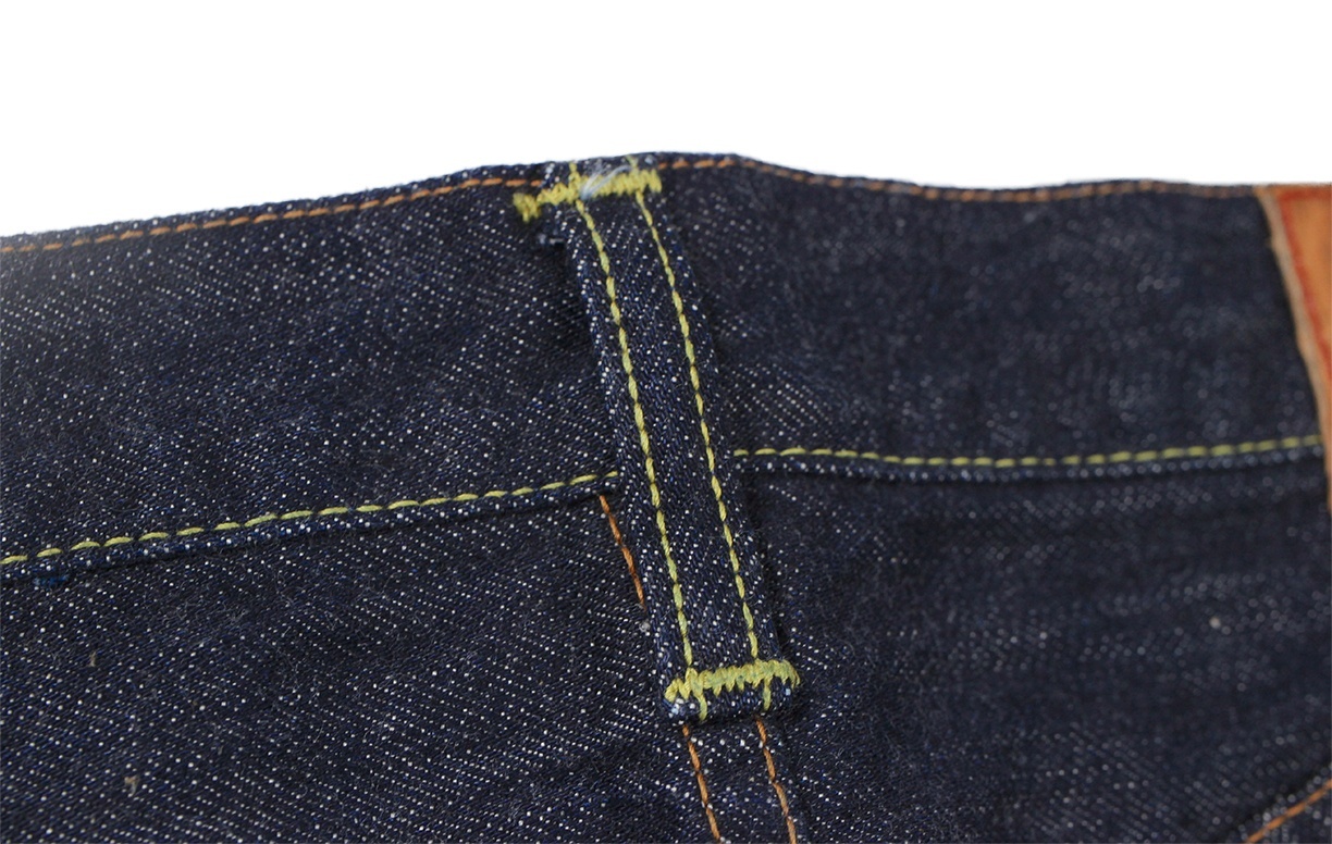 今回アプローチした個体は革パッチ、片面タブ、サイドステッチ長い、べルトループ大戦同様の太めのベルトループなど大きく年代判別できるところも再現しておりますが、コインポケットがかなり下に縫い付けられいたり、バックポケットの縫い代をかなり余分にとっていたりなど、個体の癖が強く出ているところをしっかりと再現しました。