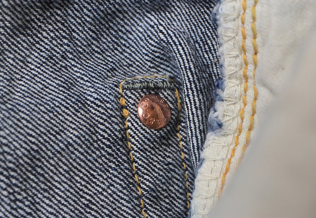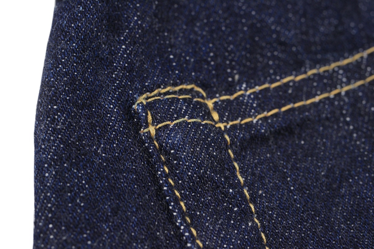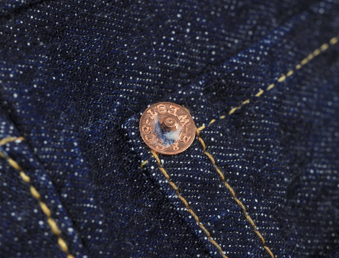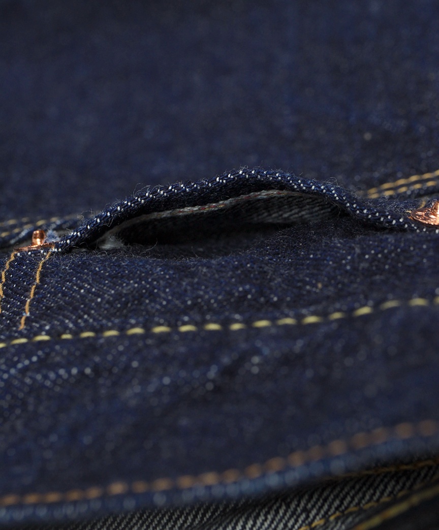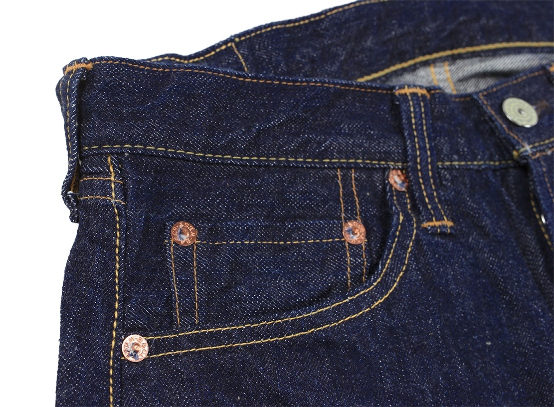 リベットは刻印無しの打ち抜きリベット、バックポケットにはフラット形状の隠しリベットを使用、