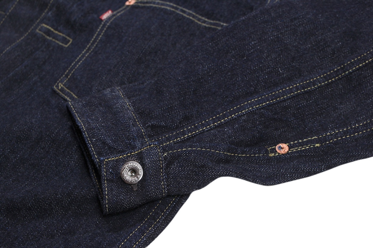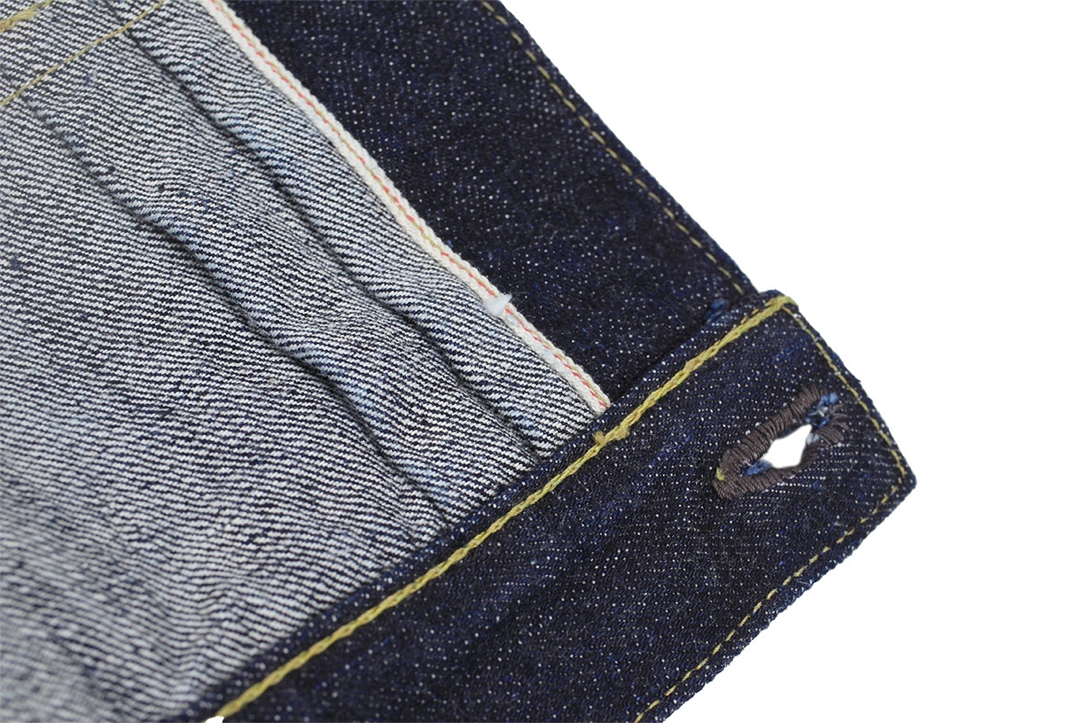 生地はあえて色落ちしづらい濃色のインディゴ染料に変更し、またオンス引き下げの制約を拒否し従来の縦糸の番手も太くする事で、結果若干オンスを引き上げた。