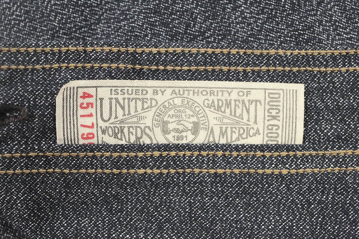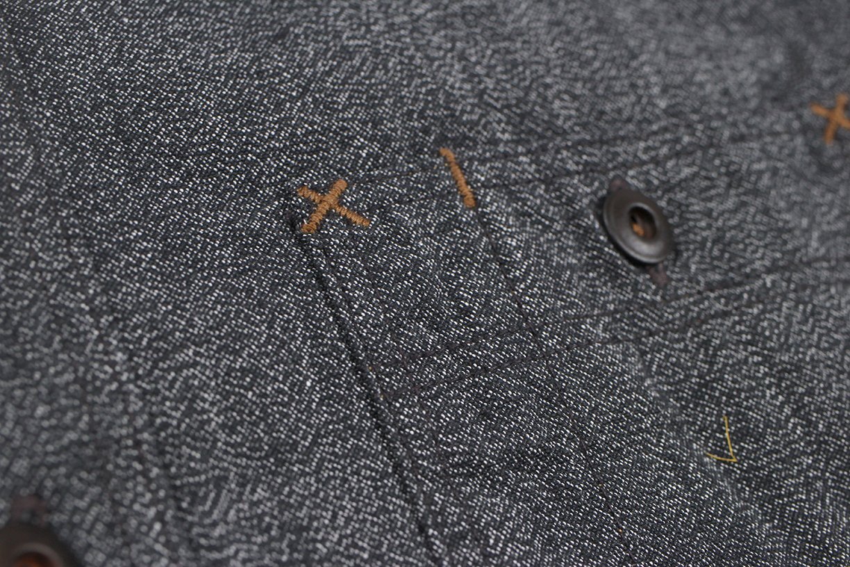 左ポケットはペン挿し付き、衿はチンストラップ付き、裾は空環仕上げ、フロント裾の裏にはユニオン・チケットが縫い付けてあります。