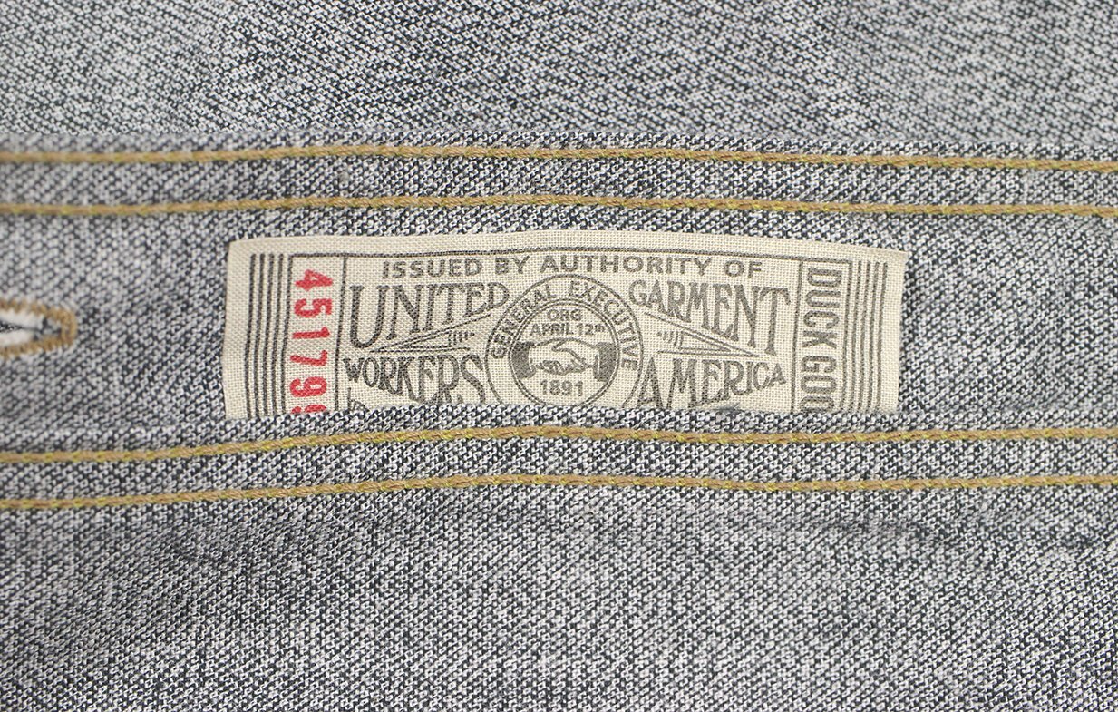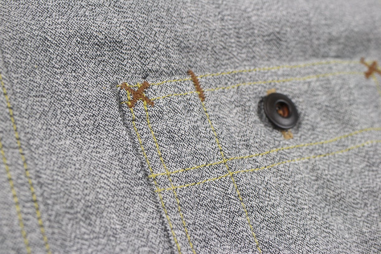 左ポケットはペン挿し付き、衿はチンストラップ付き、裾は空環仕上げ、フロント裾の裏にはユニオン・チケットが縫い付けてあります。