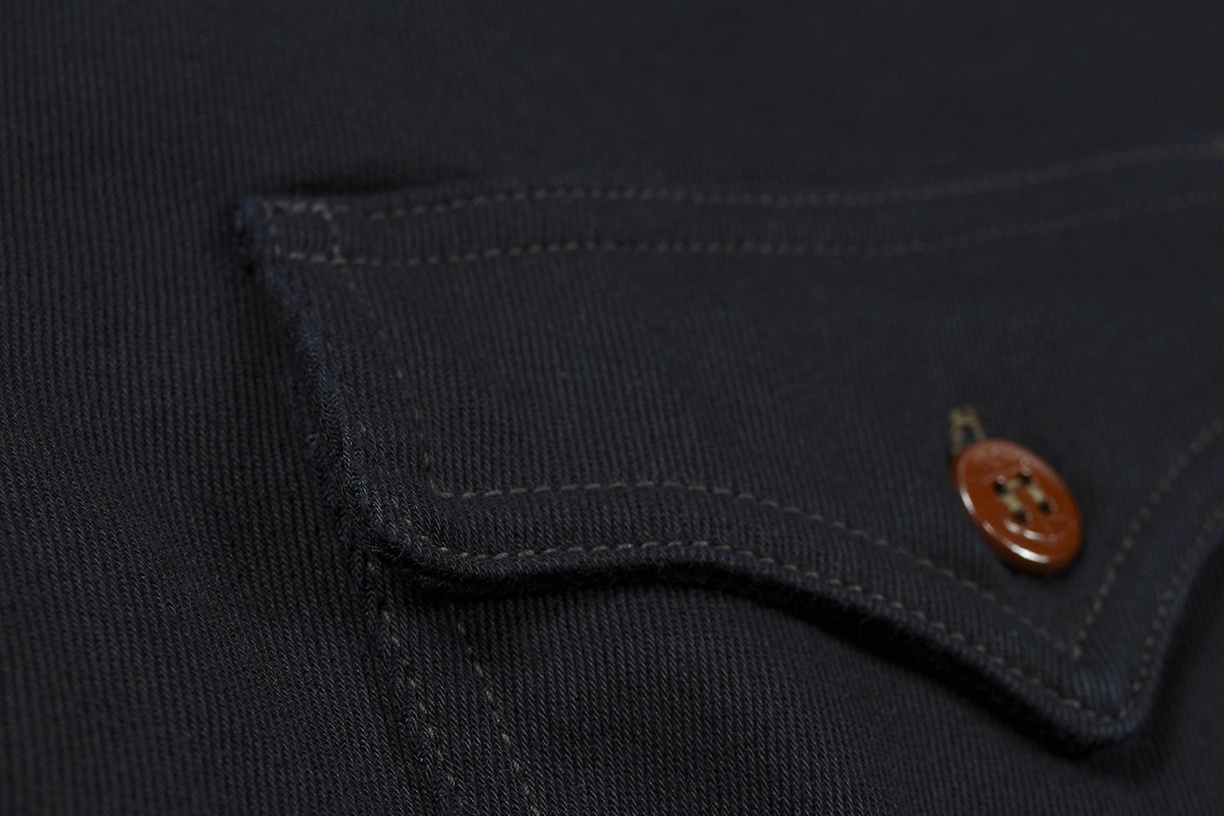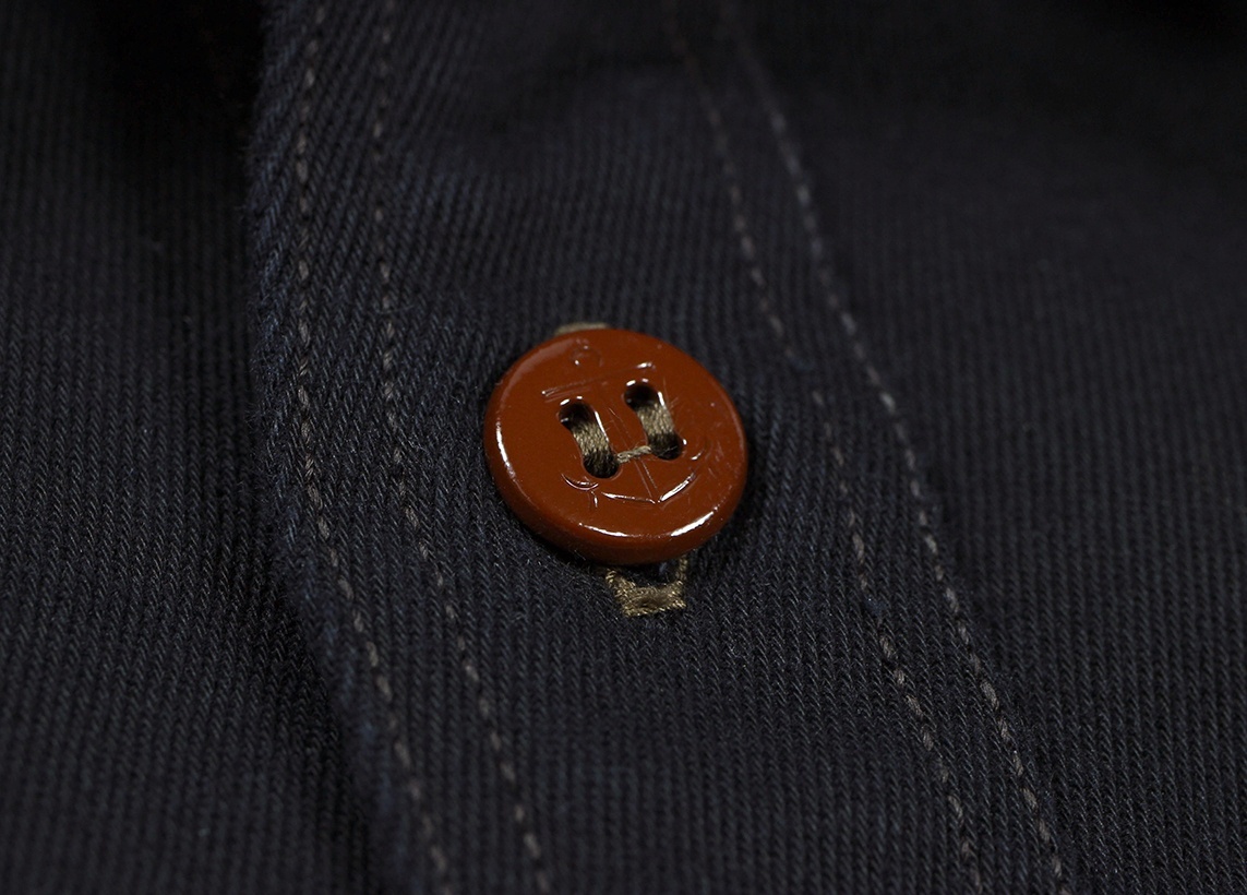 ボタンはアンカーマークの入った尿素ボタンを使用。赤味のあるネイビーにブラウンのボタンが良く映えます。