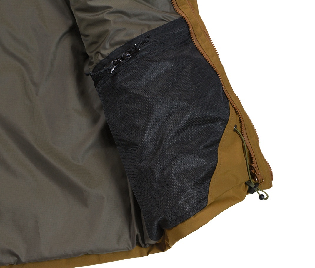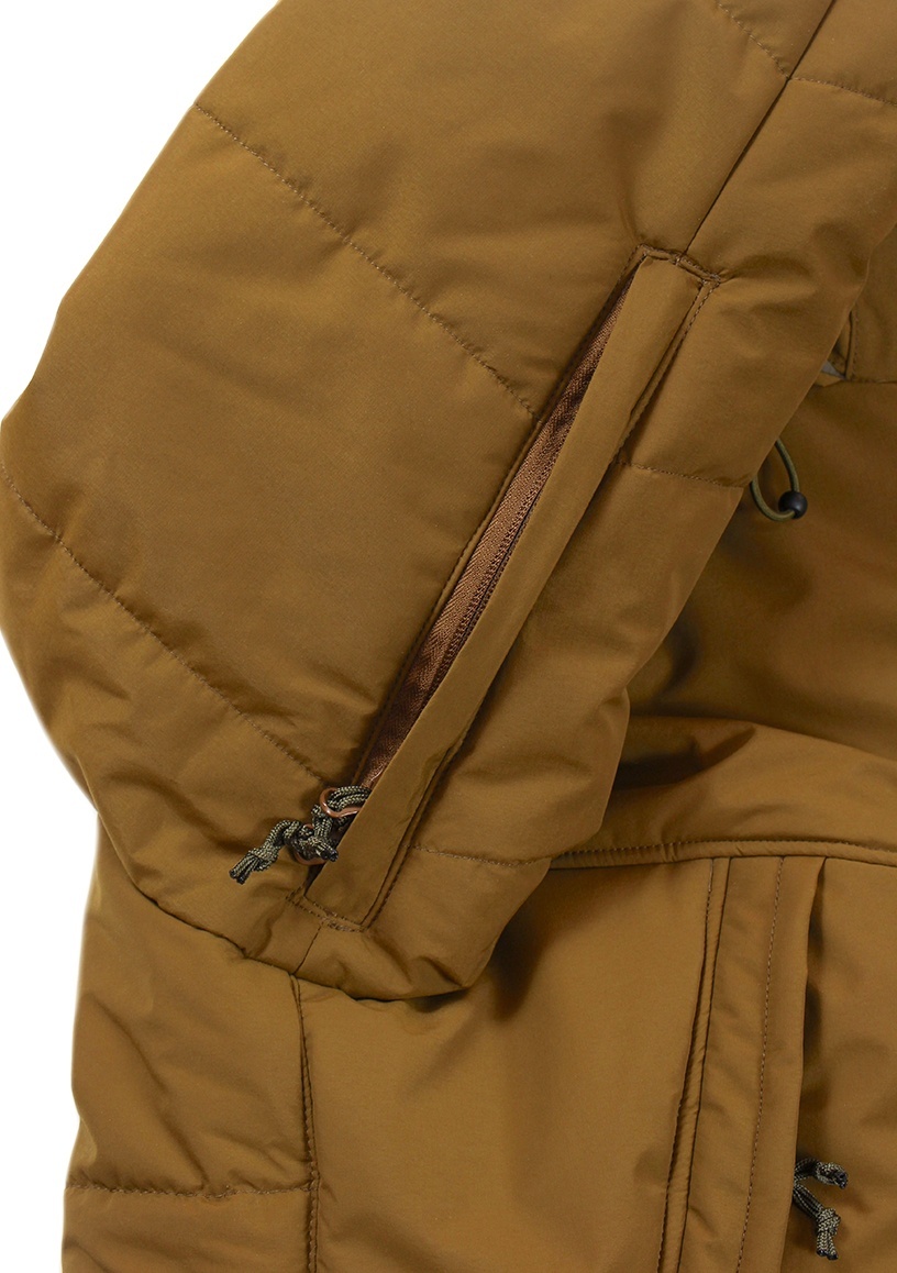 表地は防水性と通気性に優れたハードシェルのナイロン生地を使用し、中綿には保温性の高いプリマロフトを使用しています。